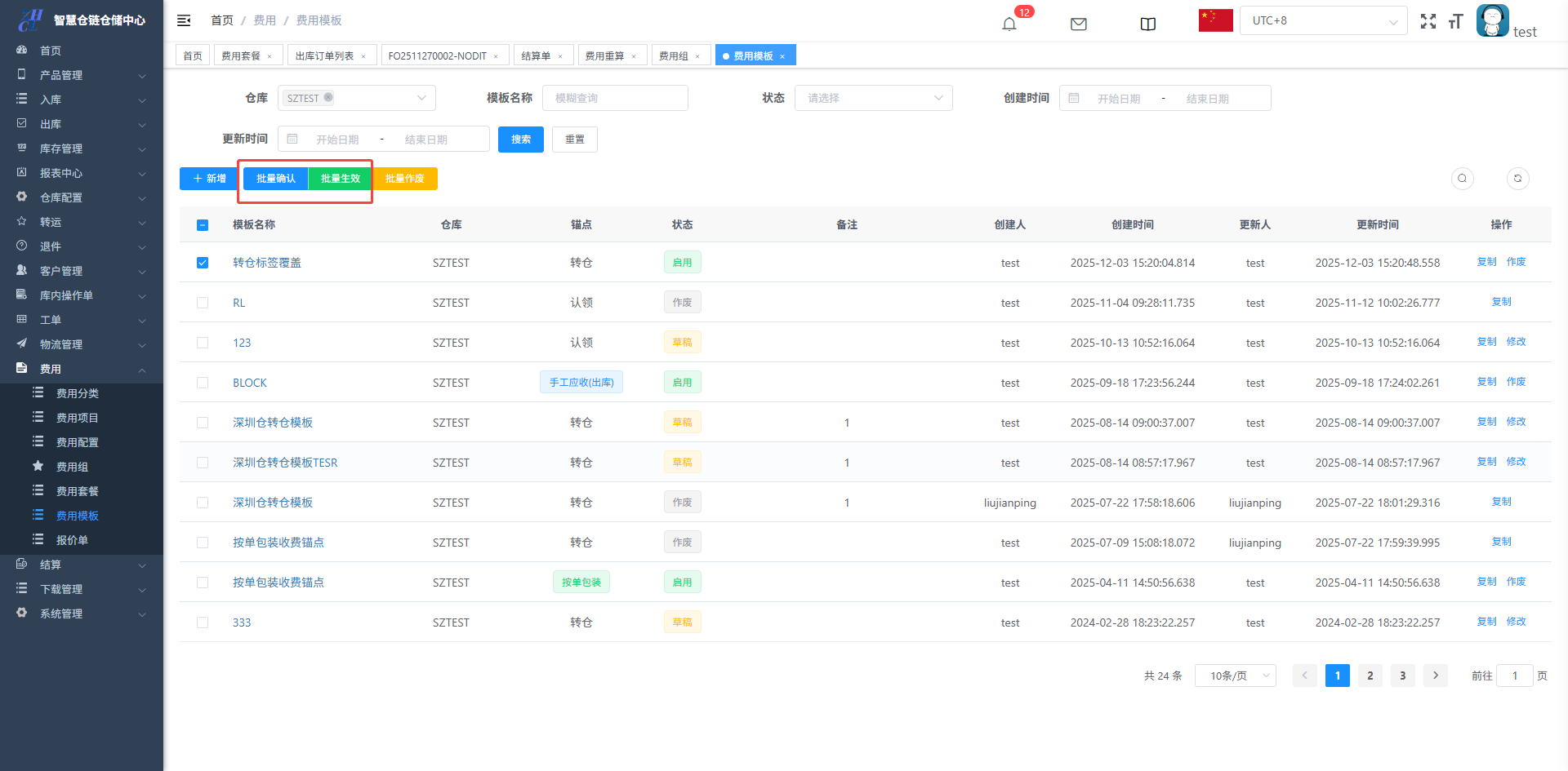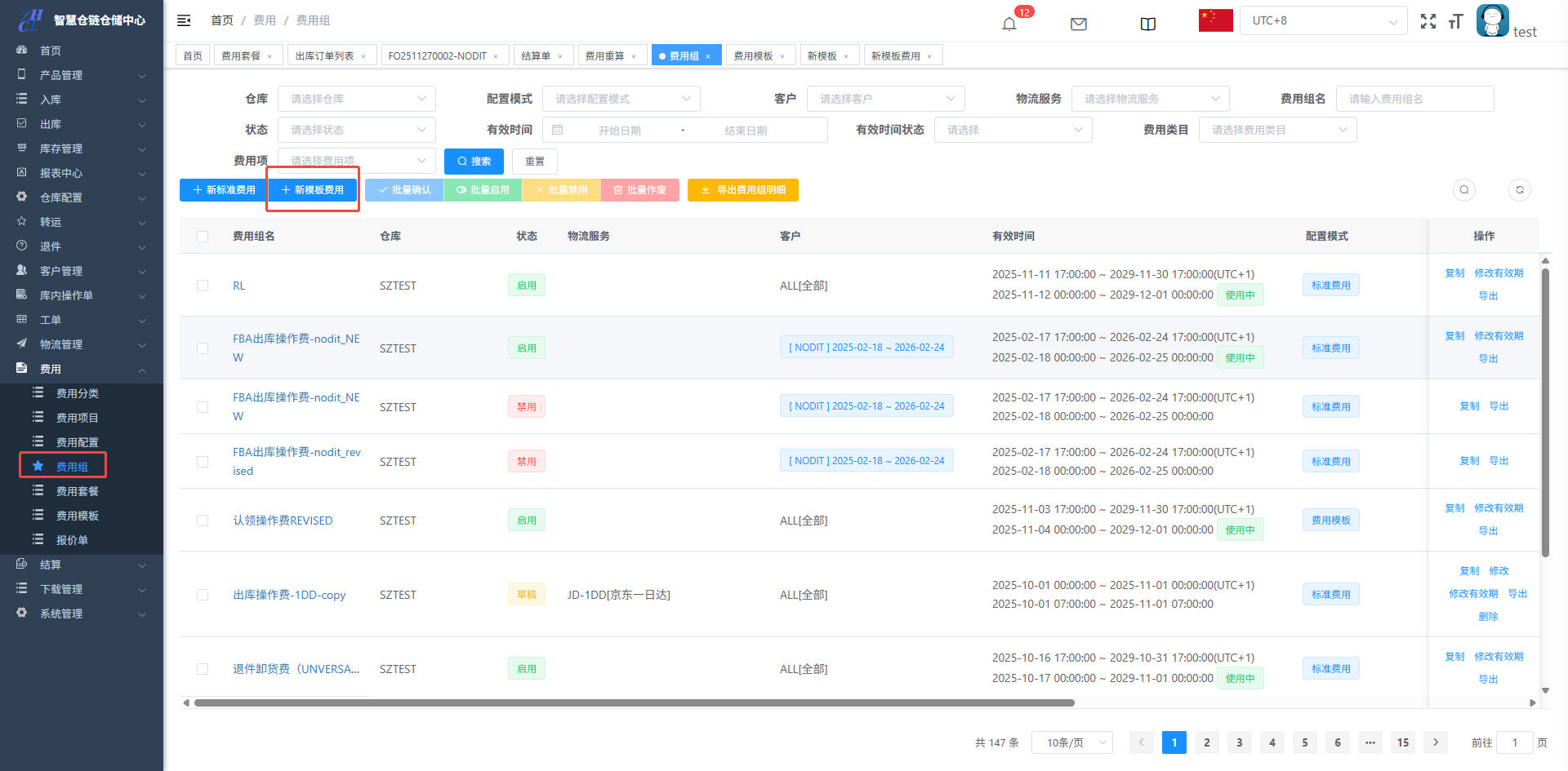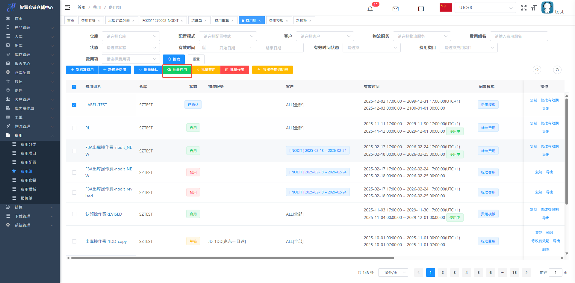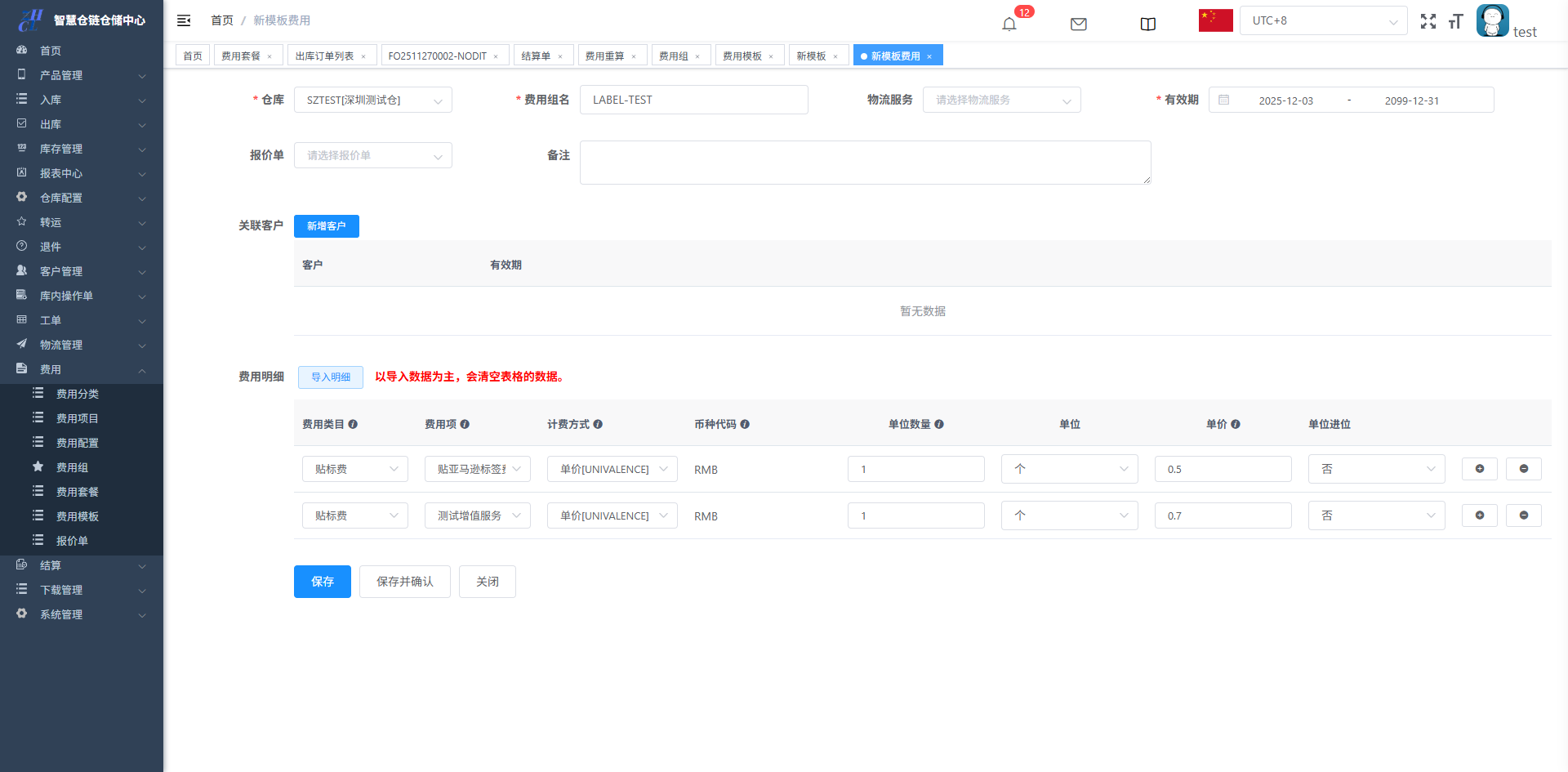 目录 搜索 展开 仓库基础数据初始化维护打印机配置&打印控件连接异常PDA输入异常和扫描回车异常仓库基础数据创建仓库(超级管理员)创建客户(客服主管)创建库位(仓库主管)创建包材(仓库主管)物流渠道(仓库主管)(已安排迭代,待更新UI优化中)官方物流自定义物流(卡派&自提)客户自上传面单黑白名单配置其他配置入库(头程入库)整单收货及整单上架按SKU收货及按SKU上架按箱收货及按箱上架边卸边上架入库异常处理出库(一件代发&转仓)物流面单获取方式一件代发(标准订单FO)生成单品单拣波次和单品单件包装生成多品合拣波次和包装分拣转仓生成按单拣货波次和按单包装生成按单拣货波次和转仓包装出库异常处理(缺货&破损)订单拦截(客户拦截订单)库存管理(批次锁定,SKU转换,库存调整等)批次库存库位库存SKU库存库存调整(SKU转换)退件(C端退件)买家退件认领退件物流退件库内(良品不良品转换,销毁等)不良品订单良品处理单转运(越库,快进快出)转运列表物流管理(价格配置)物流分区重量段模板物流价格特殊规则(UI待更新)费用( 海外仓标准计费项目)入库费用配置出库费用配置仓租费用配置退件费用配置费用套餐配置费用模板(模板费用)结算(财务)结算单(导出&重算)手工应收(其他费用入账)客户入账收款账户账单工单(客服团队)配置列表创建工单 暂无相关搜索结果! 阅读次数:38 本文档使用 NewoudaDoc 发布 费用模板(模板费用) 2.6费用模板2.51先配置需要放在特定操作页的费用项入口:费用-费用模板-新增2.52再配置对应费用项的价格入口:费用-费用组-新模板费用2.6费用模板此功能在于在特定的操作页,带出对应的费用项,操作人员根据实际操作添加数量即可生成结算单,比如标签费用模板需要与费用组-新模板费用配合使用2.51先配置需要放在特定操作页的费用项入口:费用-费用模板-新增锚点比如转仓对应转仓包装的,按单包装对应按单包装勾选之后确认,并且生效2.52再配置对应费用项的价格入口:费用-费用组-新模板费用勾选之后确认,并且生效效果展示,对应的转仓包装则会带出这两个收费项,根据实际录入数量即可,不录入则不生成作者:关冲 创建时间:2025-06-16 17:42最后编辑:关冲 更新时间:2025-12-18 15:33