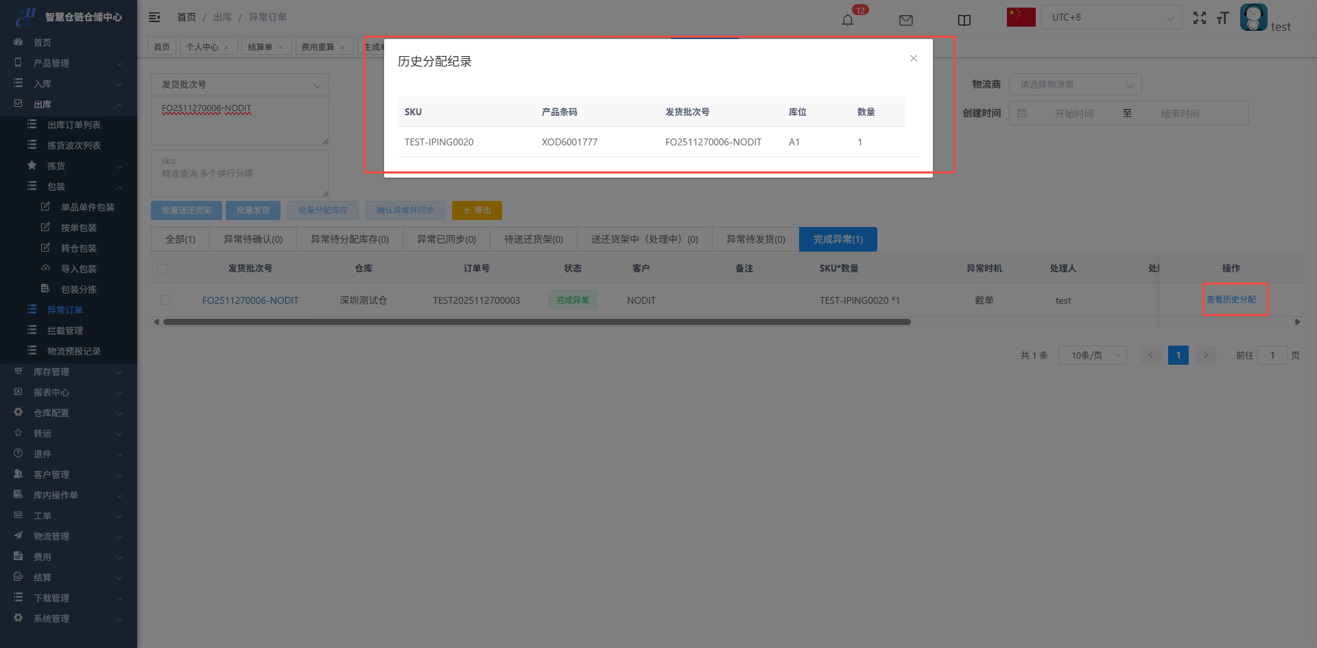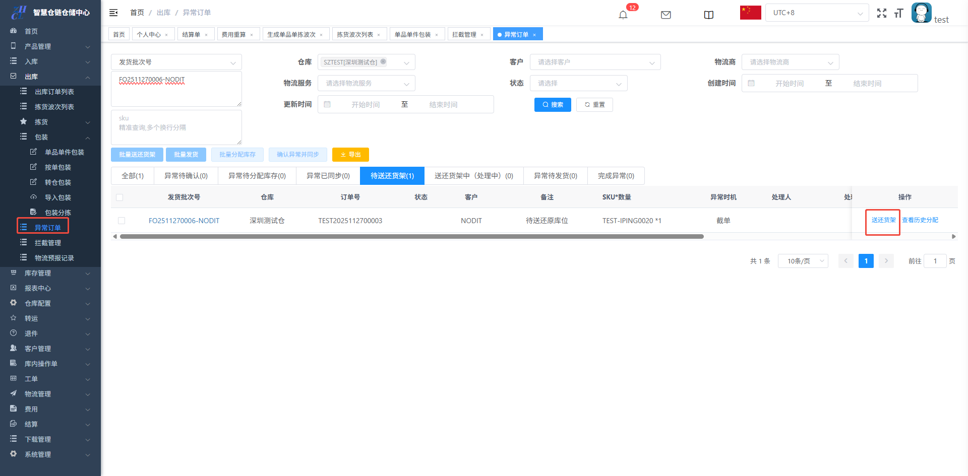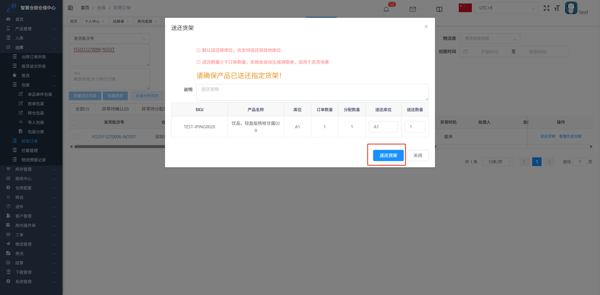 可以在异常订单中做送还货架的操作,则单据被拦截成功