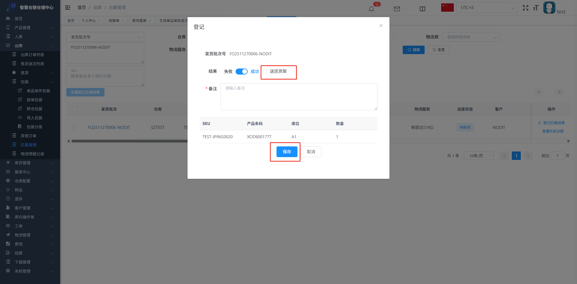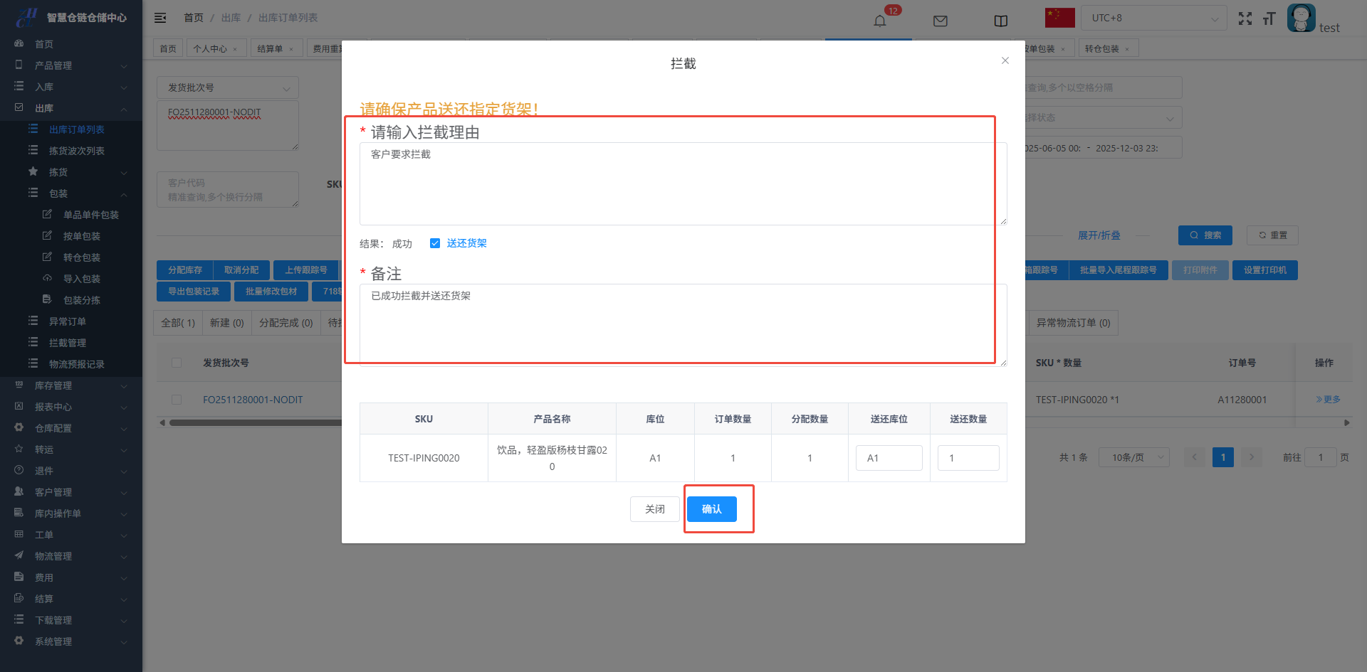 录入拦截理由和备注,线下将SKU送还货架,则单据被拦截成功