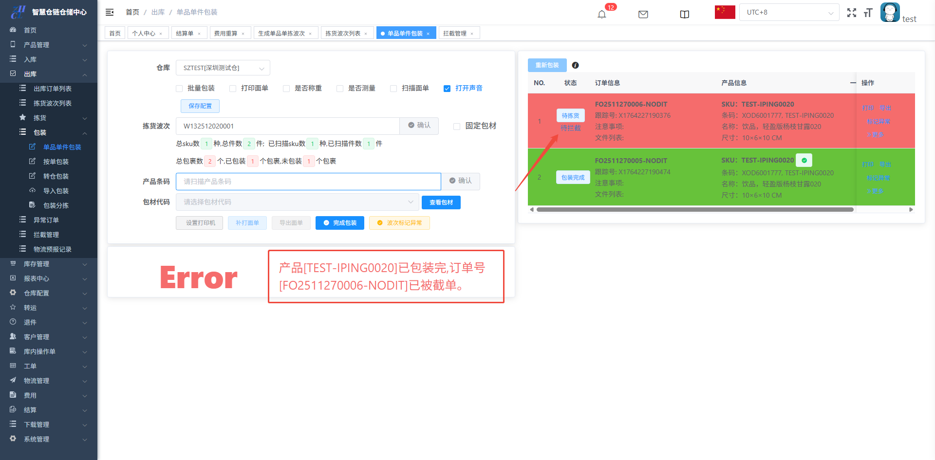 2.单据在被操作中:单据在包装环节:单品单件包装,按单包装,包装分拣,转仓包装的过程中,仓库人员正常操作即可
