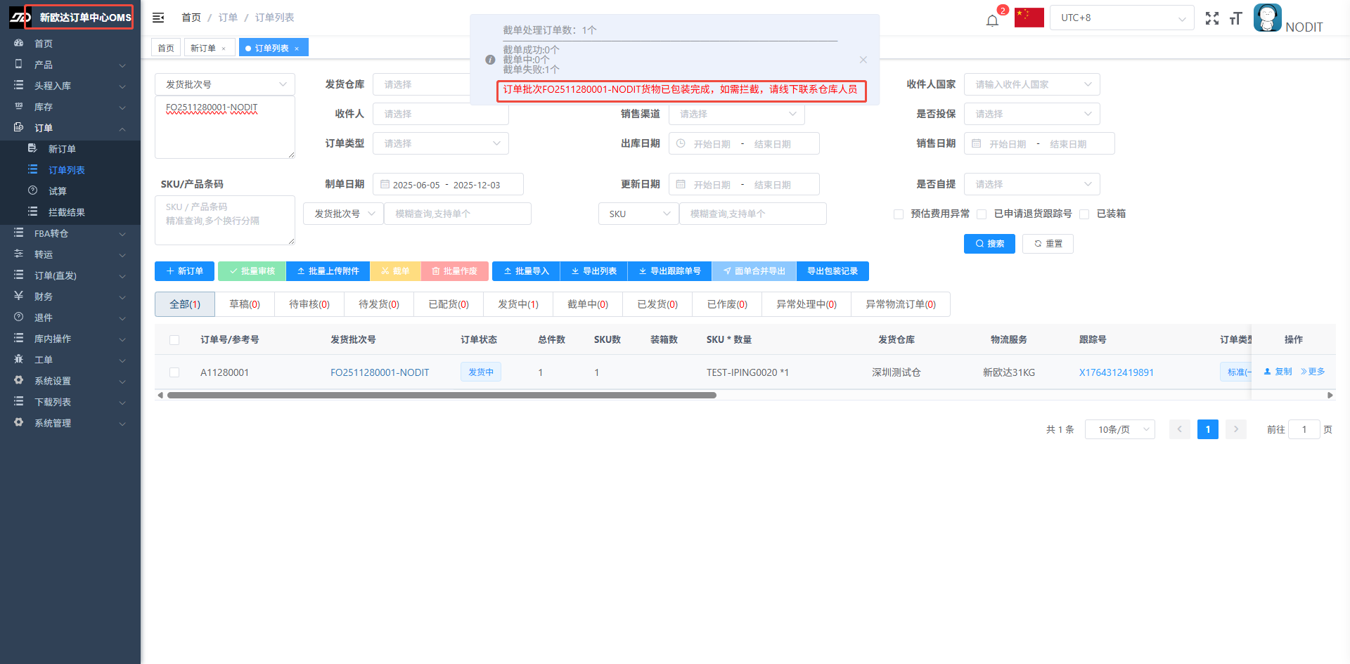 3.单据包装完成:单据包装完成的节点,货物实际上尚未被物流商揽收,OMS端发起拦截,会做如下提示