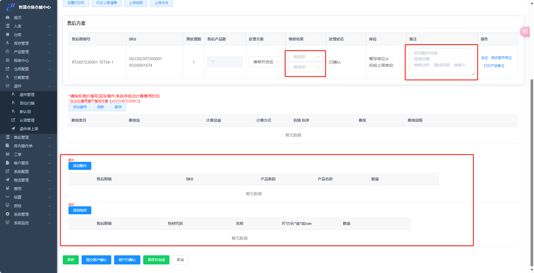 4.线下完成维修后,根据实际维修的情况填写数据和备注,也可以录入配件和包材。