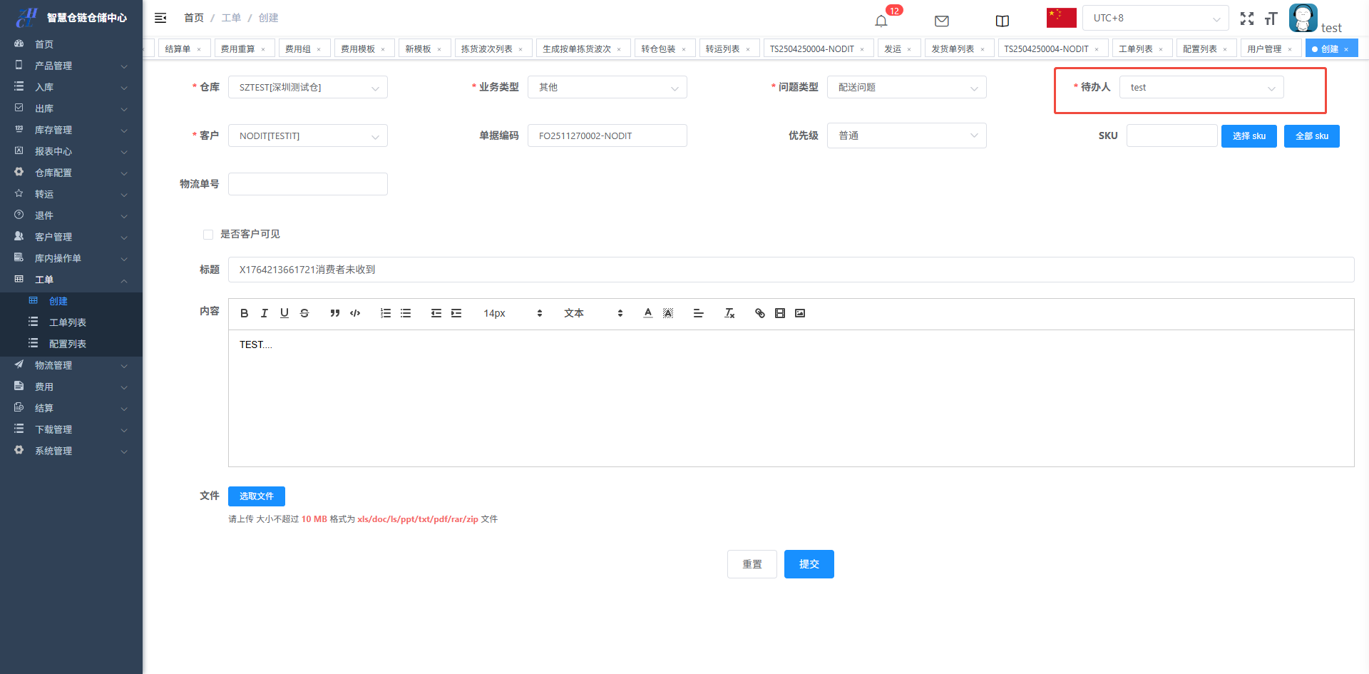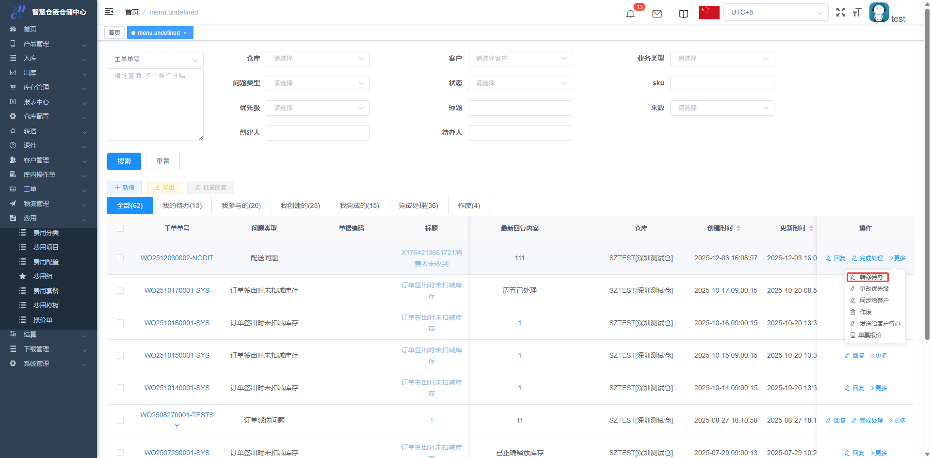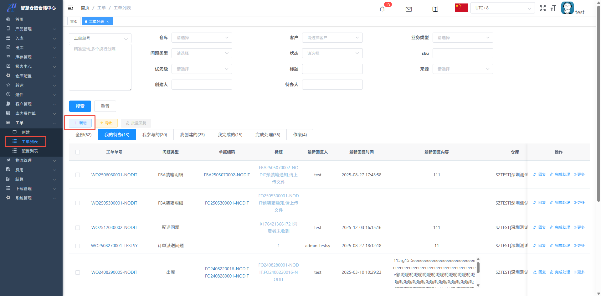 目录 搜索 展开 仓库基础数据初始化维护打印机配置&打印控件连接异常PDA输入异常和扫描回车异常仓库基础数据创建仓库(超级管理员)创建客户(客服主管)创建库位(仓库主管)创建包材(仓库主管)物流渠道(仓库主管)(已安排迭代,待更新UI优化中)官方物流自定义物流(卡派&自提)客户自上传面单黑白名单配置其他配置入库(头程入库)整单收货及整单上架按SKU收货及按SKU上架按箱收货及按箱上架边卸边上架入库异常处理出库(一件代发&转仓)物流面单获取方式一件代发(标准订单FO)生成单品单拣波次和单品单件包装生成多品合拣波次和包装分拣转仓生成按单拣货波次和按单包装生成按单拣货波次和转仓包装出库异常处理(缺货&破损)订单拦截(客户拦截订单)库存管理(批次锁定,SKU转换,库存调整等)批次库存库位库存SKU库存库存调整(SKU转换)退件(C端退件)买家退件认领退件物流退件库内(良品不良品转换,销毁等)不良品订单良品处理单转运(越库,快进快出)转运列表物流管理(价格配置)物流分区重量段模板物流价格特殊规则(UI待更新)费用( 海外仓标准计费项目)入库费用配置出库费用配置仓租费用配置退件费用配置费用套餐配置费用模板(模板费用)结算(财务)结算单(导出&重算)手工应收(其他费用入账)客户入账收款账户账单工单(客服团队)配置列表创建工单 暂无相关搜索结果! 阅读次数:19 本文档使用 NewoudaDoc 发布 创建工单 工单的问题类型配置:工单创建:工单-创建/工单-工单列表-创建工单处理:工单-回复工单转移待办:工单-转移待办工单完成:工单-完成处理工单的问题类型配置:工单创建:工单-创建/工单-工单列表-创建创建成功的工单,对应的待办人的待办事宜会更新工单处理:工单-回复工单转移待办:工单-转移待办工单移交给其他人处理工单完成:工单-完成处理作者:关冲 创建时间:2025-12-03 15:56最后编辑:关冲 更新时间:2025-12-18 15:34