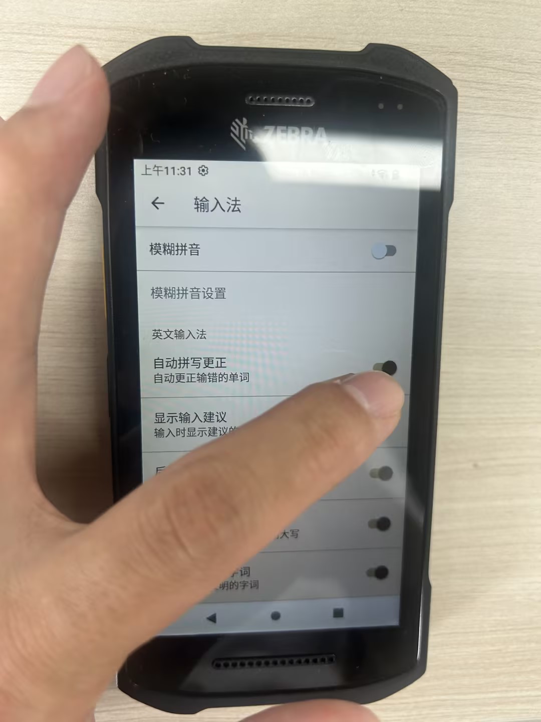 4.下滑,英文输入法-自动拼音更正,关闭(圆圈在左边为关闭)